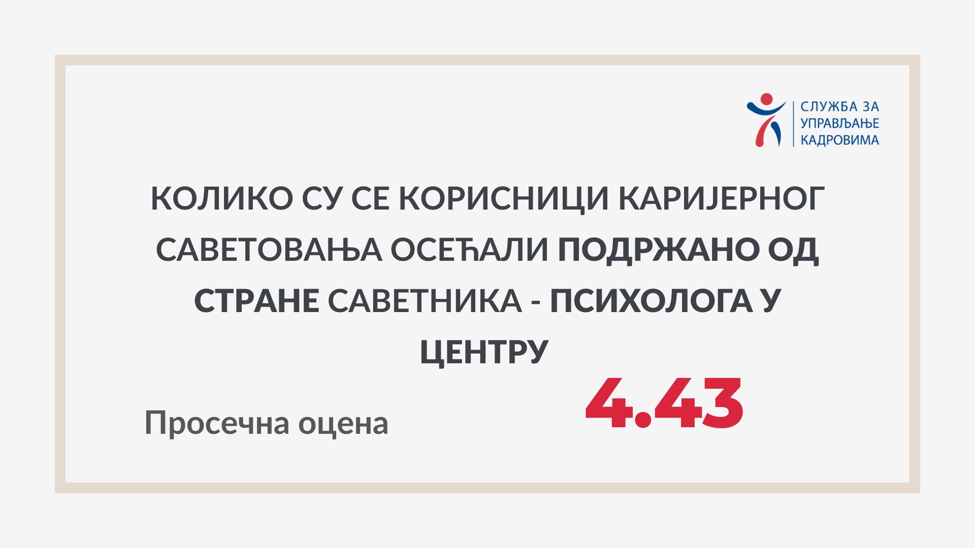 Резултат који нас такође веома радује је оцена личног доживљаја колико су се учесници осећали подржано од стране саветника (психолога у Центру) током каријерног саветовања и та просечна оцена износи 4.43.