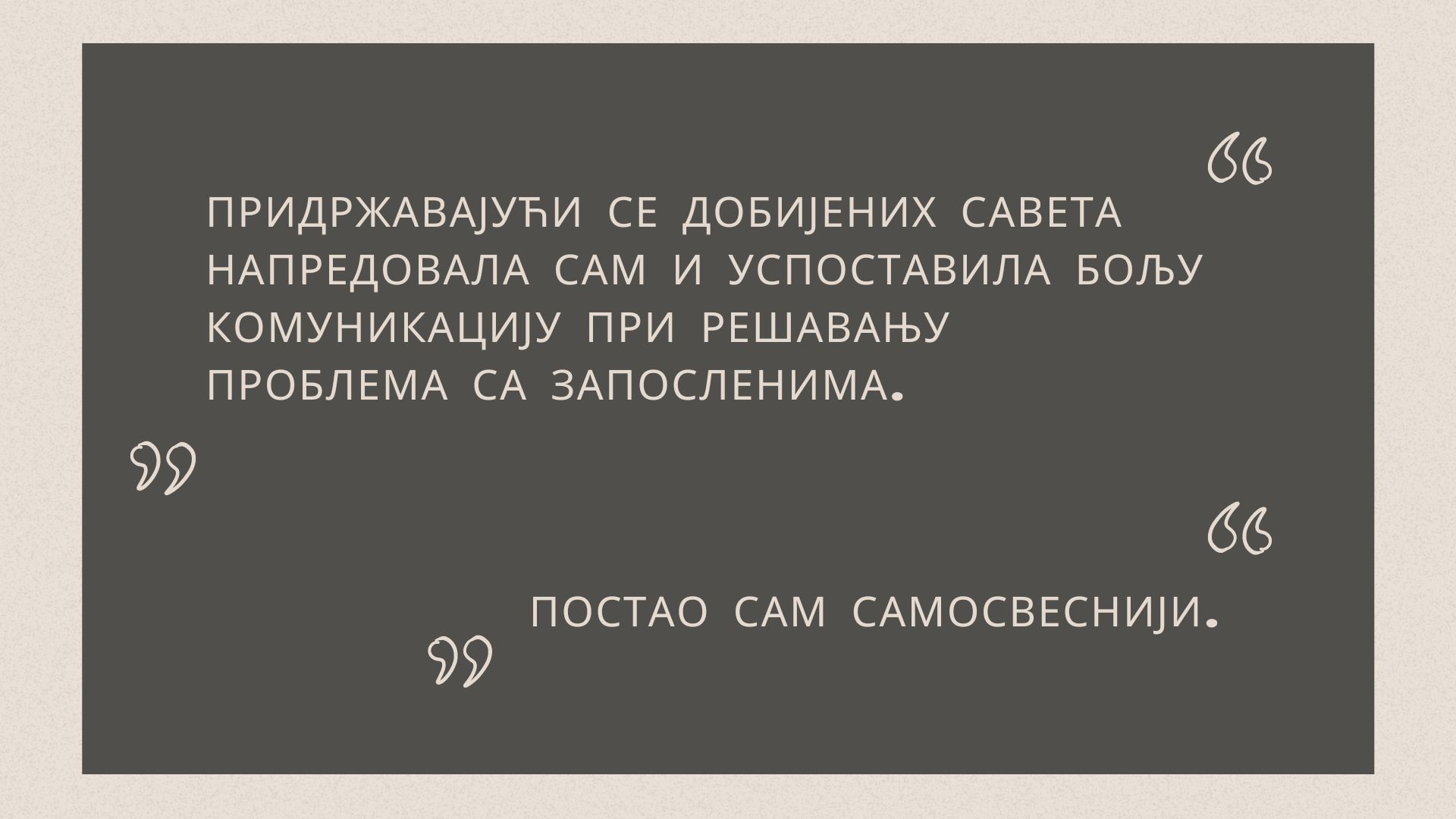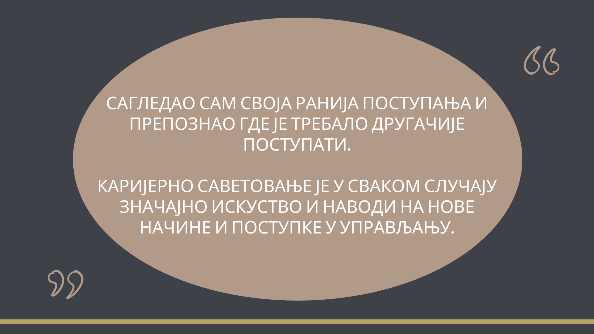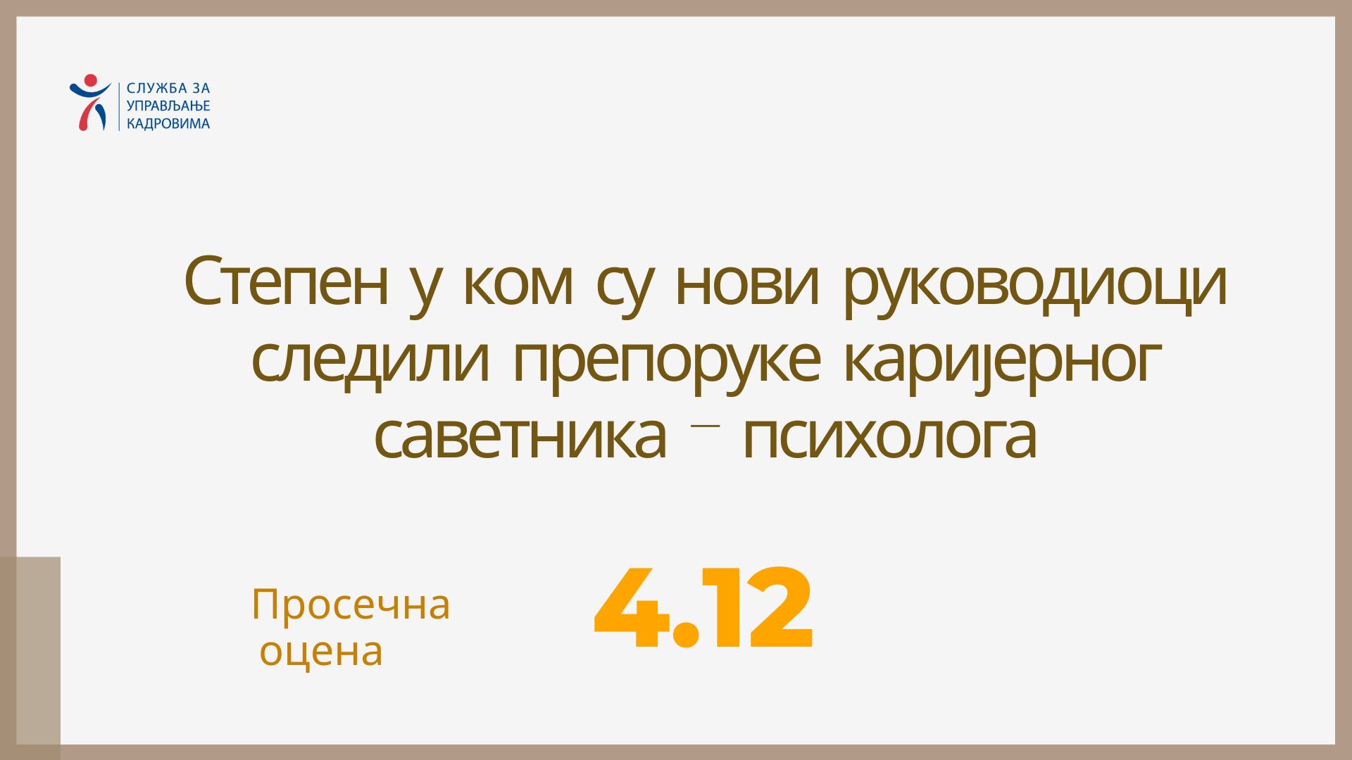 Задовољство нам је и да похвалимо саме учеснике каријерног саветовања, будући да извештавају да су у високом степену следили препоруке саветника (просечна оцена 4.12) и придржавали се добијених смерница које су применили у самом раду.